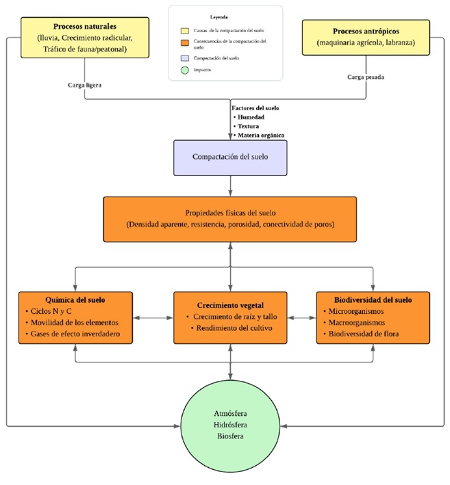 The objective of this research was to analyze the mechanisms of soil compaction under conventional tillage, contributing to the understanding of its characterization, prevention, reduction, and elimination when generated by agricultural machinery traf fic, which negatively af fects seed germination, root development, and consequently, crop yield. A systematic literature review was conducted, analyzing forty-four scientific articles published over the last 20 years and complemented with information from relevant textbooks. The search was performed in databases such as Google Scholar, Scopus, ScienceDirect, SpringerLink, Wiley Online Library, Taylor & Francis Online, Academia.edu, and ResearchGate. The results describe soil compaction, its causal factors and ef fects, and include a quantification of the loads transported by agricultural machinery and the pressures exerted at the tire–soil interface. Various prevention and mitigation strategies are presented, ranging from machinery selection and optimized operation (considering ballasting, tire types, and the incorporation of precision agriculture) to the implementation of appropriate tillage systems. It is concluded that, although compaction is inherent to mechanized agriculture, a comprehensive and proactive approach is essential for its ef fective management, making it crucial to simultaneously optimize machinery–soil contact pressure and improve soil load-bearing capacity and structure to ensure sustainable agricultural production.