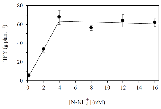 The aim of this work was to optimize the ammonium concentration in the irrigation solution of pot-grown blueberry plants for fruit yield and quality, under protected conditions. An experiment was developed with blueberry (Vaccinium corymbosum L.) plants var. Biloxi, with six treatments of ammonium concentrations in the irrigation solutions: 0.2 mM, 2.0 mM, 4.0 mM, 8.0 mM, 12.0 mM, and 16.0 mM, which were repeated four times, generating 24 experimental units (EU), with four plants each. At 200, 215, and 231 days af ter treatments application the fruits were harvested to evaluate fruit yield (FY), total fruit yield (TFY), proportional fruit yield for each harvest date (PFY), fruit diameter (FD), and soluble solid content (ºBrix). The results showed that TFY increased with ammonium concentration until 4.0 mM and beyond slightly decreased; the pattern displayed by PFY showed that plants irrigated with solutions with ammonium concentrations higher or lower than 8.0 mM and 4.0 mM, respectively, delayed their fruit ripening. The ef fect of increasing N concentration on FD passed from a slight increase to a null ef fect and to an evident decrease for the first, second, and third harvest dates, respectively. The fruit ºBrix increased with ammonium concentration, but decreased 24.0% and varied only 4.6% for the treatments 2.0 mM and 16.0 mM of ammonium, respectively, from the first to the third harvest date. It was concluded that the optimum ammonium concentration in the irrigation solution of blueberry plants grown in pots under protected conditions was 4.0 mM.