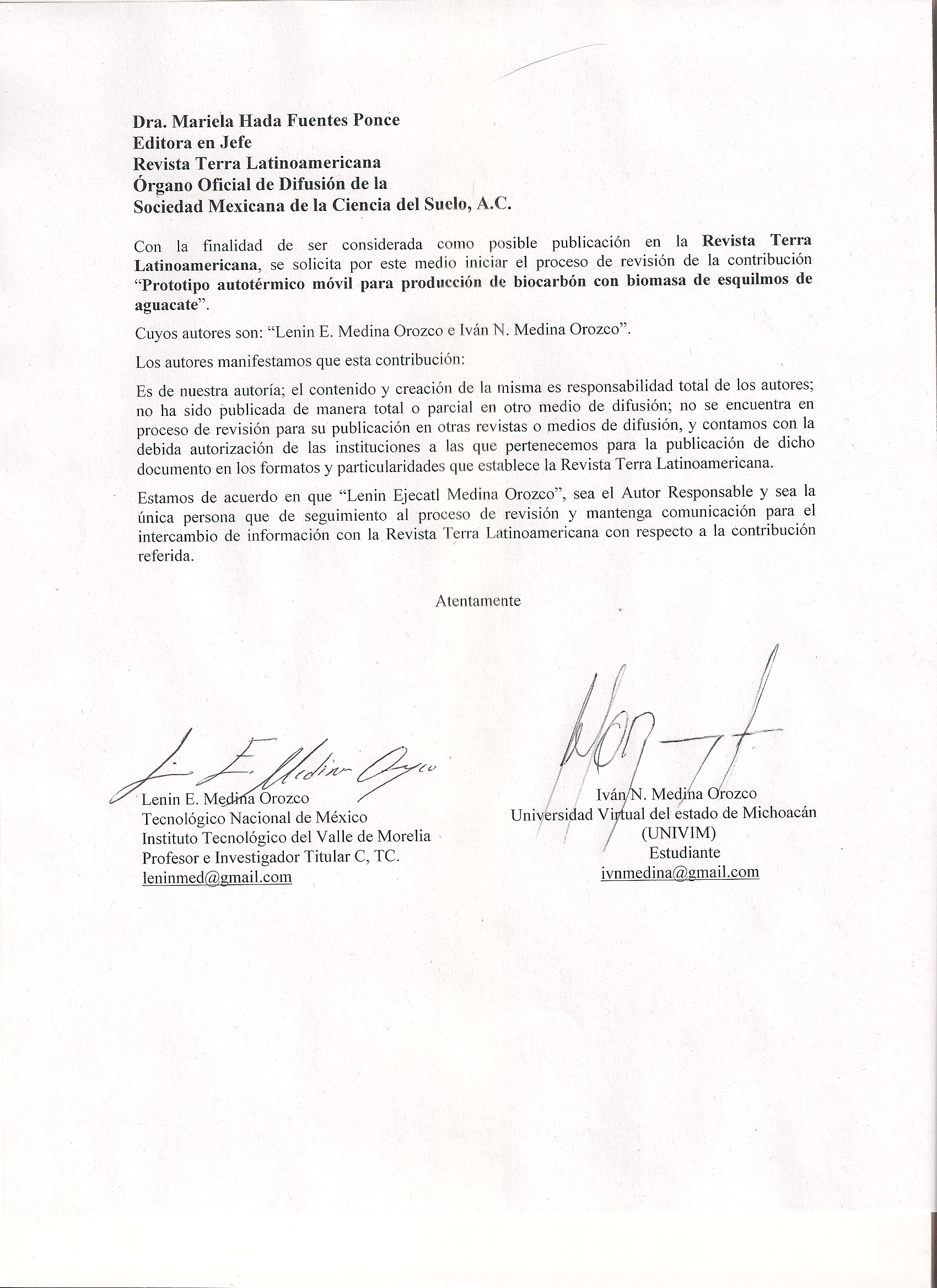 The state of Michoacán, Mexico, is the world’s largest producer of avocado. The social and economic impact of this crop depends on the area under cultivation. By-products of this activity are derived from pruning for tree maintenance. Using avocado byproducts is seen as an economically, environmentally and socially viable alternative for producing biochar in large volumes, without extracting timber from forests and pristine jungles. The objective of the present study was to build a mobile autothermic biochar-pyrolysis prototype, with a useful volume of 1.7 m3 of crushed biomass and evaluate its performance in field conditions. The equipment was built of stainless steel to give it a useful life of 7 years of intensive use, with mobility within the agricultural fields. It is autothermic so as not to depend on an external heat source. The equipment was low-cost compared to commercial equipment ($ 700 000.00 MN pesos) and has future potential in cogeneration of energy. The main variable in manufacturing cost is the market price of stainless steel. The equipment reported a conversion rate of biomass to biochar, under field conditions, of 300 to 400 kg per day, with an average recovery rate of 16% in biochar. The main variables in the transformation of biomass to biochar were moisture, size of chips and atmospheric conditions. A Cation Exchange Capacity (CEC) of 46 Cmolc kg‑1 and pH 10.25 were found. The equipment successfully transformed avocado biomass, and the biochar had suitable characteristics for volcanic soils.Downloads