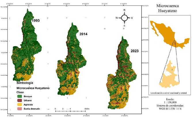 The Hueyateno micro-watershed is located in the upper part of the Sierra Norte de Puebla and covers 8347 ha. Between 1993 and 2023, it experienced significant land use and cover transformations, reflecting the ef fects of urban and agricultural expansion to the detriment of natural ecosystems. These changes caused forest cover loss, af fecting water regulation and soil stability, which represents a challenge for environmental sustainability. The aim of this study was to analyze spatial and temporal changes to identify transformation patterns and their implications. Landsat