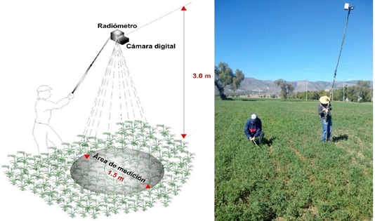 The fraction of vegetation cover (FVC) and the Leaf Area Index (LAI) are biophysical variables closely related to the evapotranspiration rate of crops and their biomass production. Despite their importance, they are usually not measured directly due to their time-consuming and costly nature; however, they can be estimated on a large scale and near-real-time using spectral information captured in satellite images, although this requires prior validation at the field level. Simple linear regression models were developed and validated using 13 vegetation indices (VI) related to LAI and FCV in alfalfa (Medicago sativa). Three spectral information sources were used: (i) reflectance to derive the VI; (ii) digital photographs processed with the Canopeo application to estimate FVC; and (iii) direct LAI measurements using a ceptometer. Six field samples were taken between March and June, 2020 in four alfalfa plots located in Palmar de Bravo, Puebla, Mexico. To evaluate each VI, the determination coef ficient (R2) and the root mean square error (RMSE) were used. We found that the most suitable VI for estimating FVC was the VIgreen (Green Vegetation Index, R2 =0.987 and RMSE = 0.093). For the LAI, the VI that performed best was the NDVI (Normalized Dif ference Vegetation Index, R2 = 0.935 and RMSE = 0.746). The results showed the suitability and practical utility of spectral information for estimating biophysical variables in alfalfa cultivation and their monitoring.